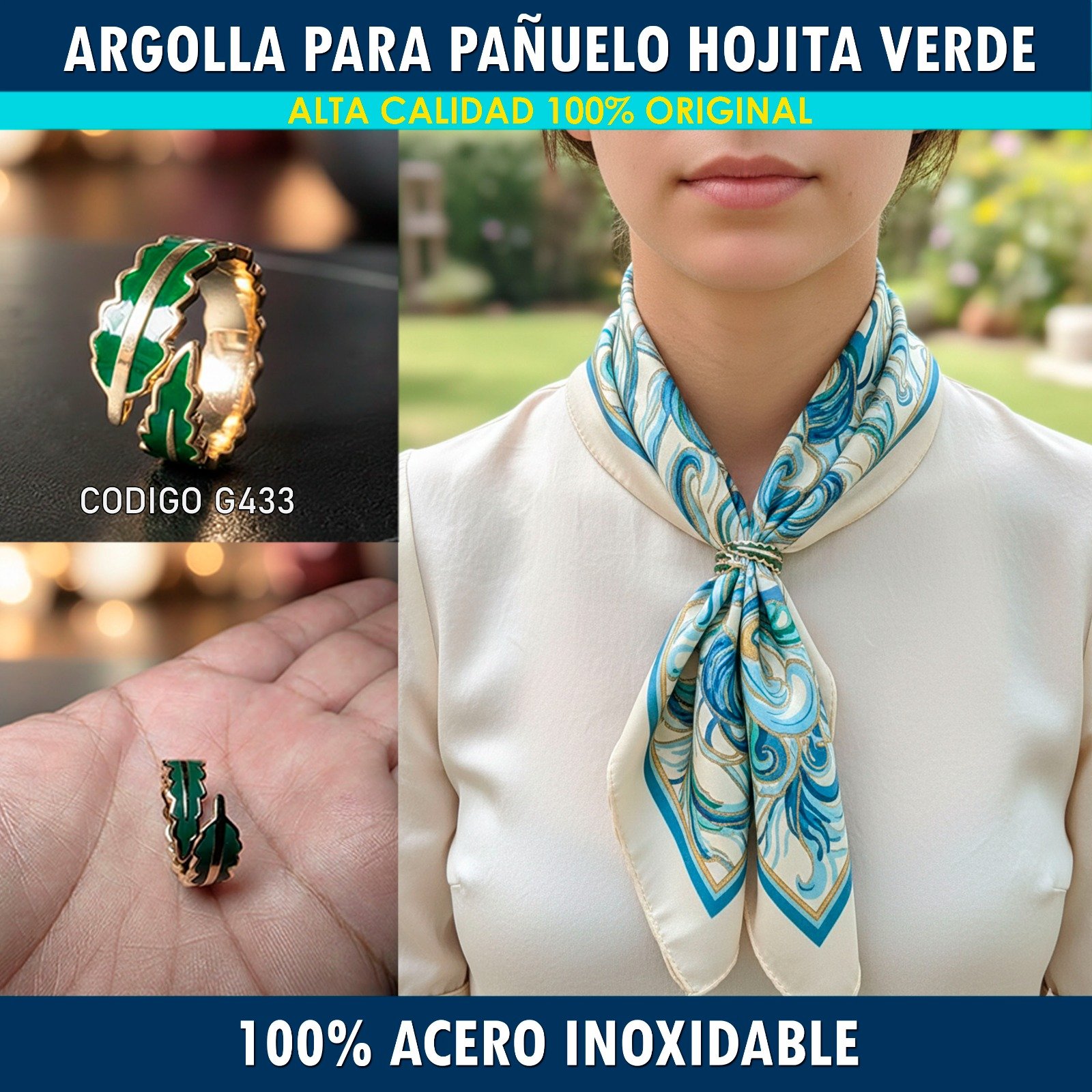 La Argolla G433 no es solo un sujetador de pañuelos, es una pequeña declaración de estilo. El verde esmeralda es el color de la armonía y la frescura; llevarlo en este diseño de «hojita» añade una capa de sofisticación orgánica a cualquier look. Ya sea que la uses para una reunión importante o para un evento casual, esta pieza ilumina tu rostro y aporta un toque de color estratégico que denota seguridad y buen gusto.