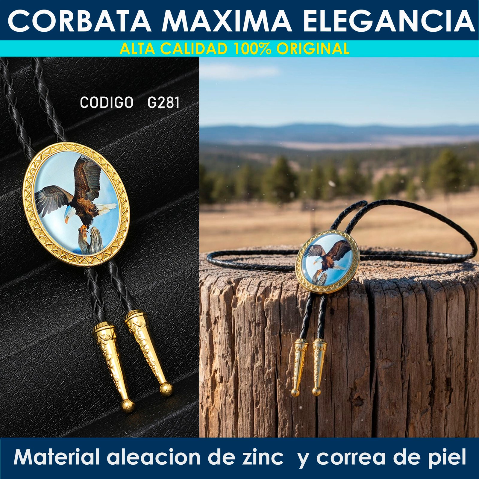 Haz una declaración de estilo con nuestra imponente corbata bolo de medallón dorado ovalado, que lleva en su interior una majestuosa imagen de águila, símbolo de libertad, fuerza y visión.
